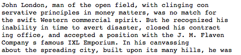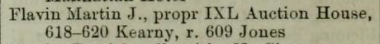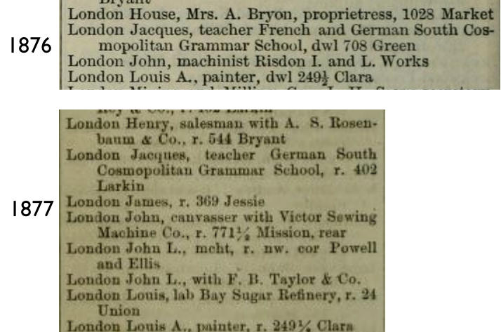 John London was once a farmer, but worked a series of odd jobs after moving to California, one of which was a carpenter. He also worked for the Singer Sewing Machine company, which makes me wonder about the 1877 Victor Sewing canvasser, though the address makes no sense, nor does F. B. Taylor. He did work for Martin Flavin’s IXL Auction House: