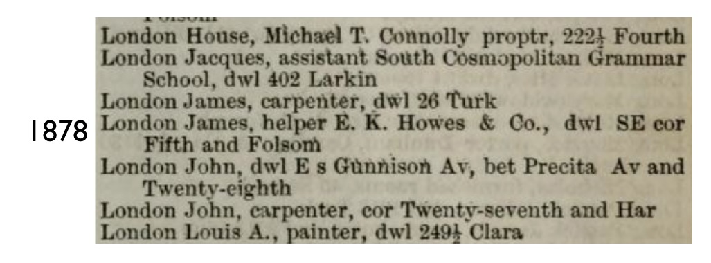 Jack’s adopted father was John London, a Union veteran who married Jack’s mother Flora after Jack’s birth. But there are two John Londons! Which one? Also, how does 27th meet up with Harrison? And where is Gunnison Ave and Precita? And how does 28th have anything to do with Precita?