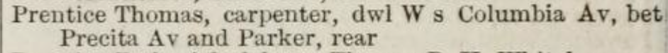 I may have found the address of Thomas Prentiss, the husband of Jenny Prentiss, Jack’s “wet nurse, foster mother and lifelong friend…” Jenny Prentiss’ husband worked with John London, and there is a Thomas Prentice listed in the 1878 directory as a carpenter, one street over from Gunnison (now Harrison) on Columbia (now Alabama) between Precita and Parker (now Montcalm).