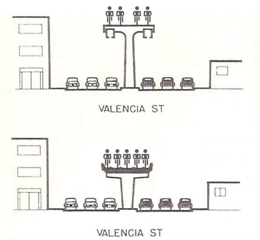 Had the mid-twentieth century had its way, this might have been! A 1956 proto-BART proposal had an elevated train running down Valencia Street! This would have obviously been abandoned and converted into a High Line West at some point. Behold the Valencia Skycycle!